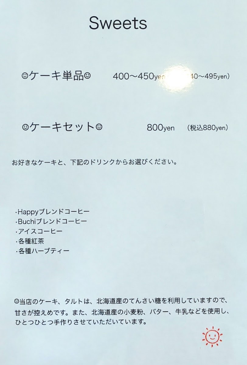Welcome to Cafe Buchi, a charming hideaway in Tomakomai, Hokkaido, where tranquility meets delectable flavors. Nestled amidst a serene landscape, this cozy cafe offers an inviting ambiance, perfect for a leisurely escape. The menu is a delightful blend of hearty and sweet options, featuring standout items like the Creamy Cheesecake for ¥540, paired beautifully with the aromatic Happy Blend Coffee or the rich Buchi Blend Coffee, both priced at ¥550.